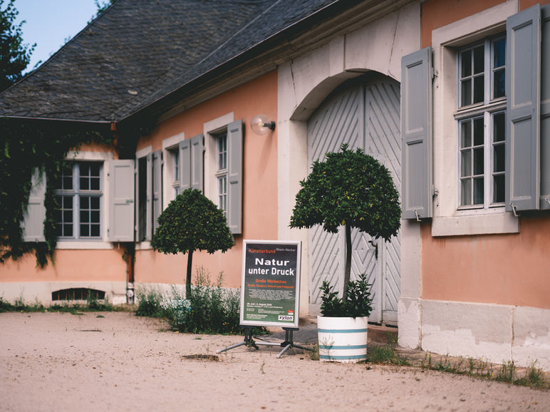 Das Museum, in den historischen Mauern der kurfürstlichen Anlage direkt gegenüber der Orangerie, bot den eindrucksvollen Rahmen für eine vielfältige Werkschau zeitgenössischer Positionen zum Verhältnis von Mensch, Natur und Druck.