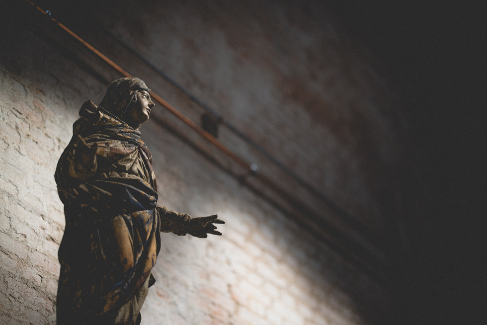 Das Licht fällt von links, tastet sich vorsichtig über ihre Schulter, verfängt sich in den Haaren, die zu einem losen Knoten gebunden sind. Es ist kein heroisches Licht. Kein inszeniertes. Es ist ein warmes Licht. Eines, das nicht enthüllt, sondern andeutet.